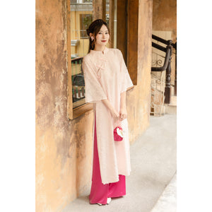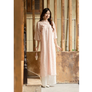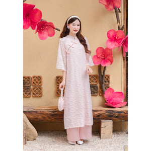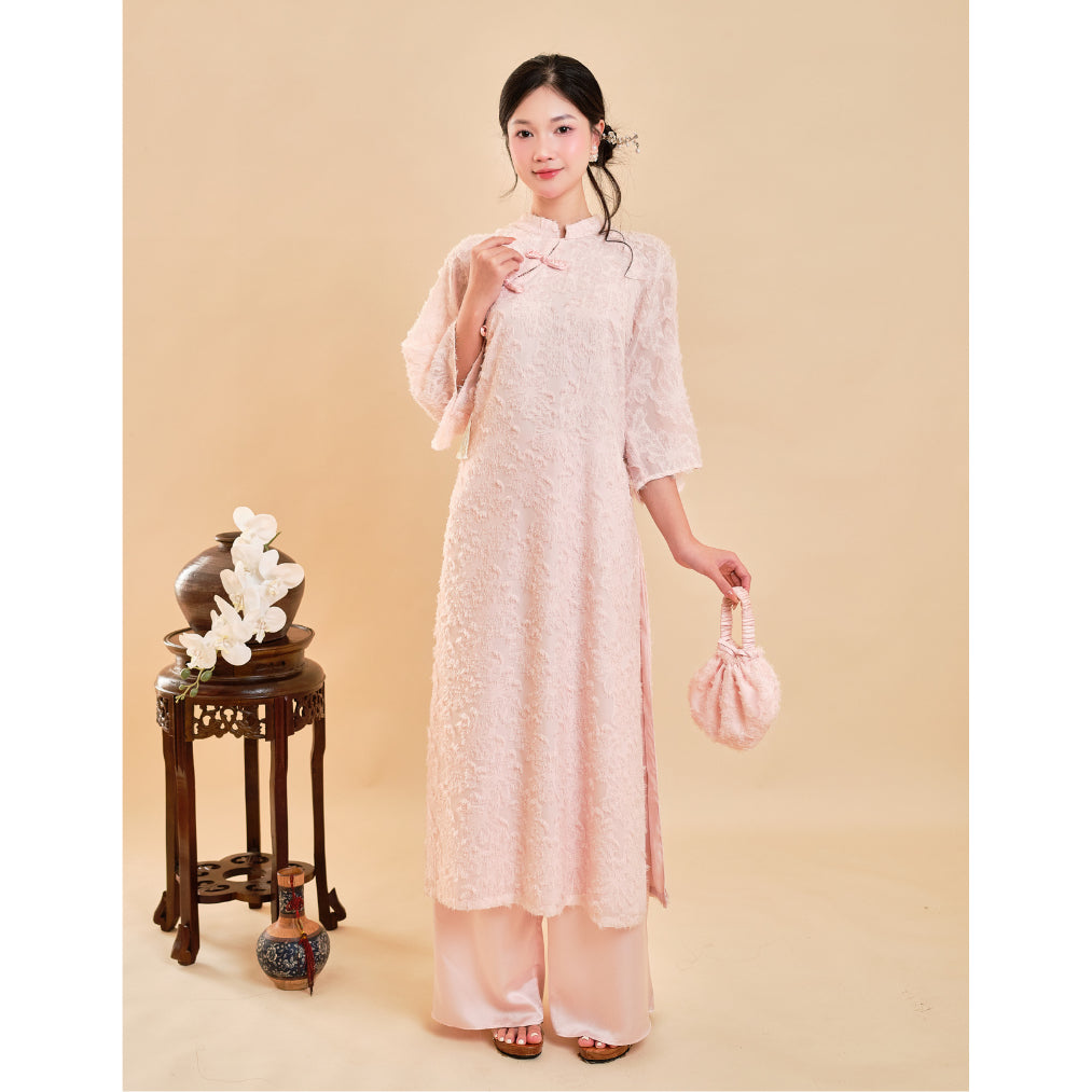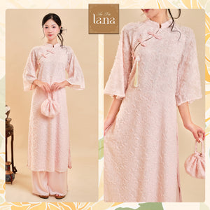 Modernized Ao Dai with soft pink Chau Sa and pearl silk pants with prominent asymmetrical bow – SD011 LANA DESIGN