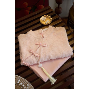 Chau Sa pink modernized ao dai, soft fur with pearl silk pants and prominent asymmetrical bow – SD011