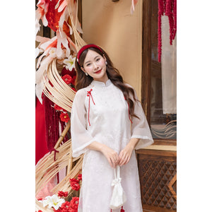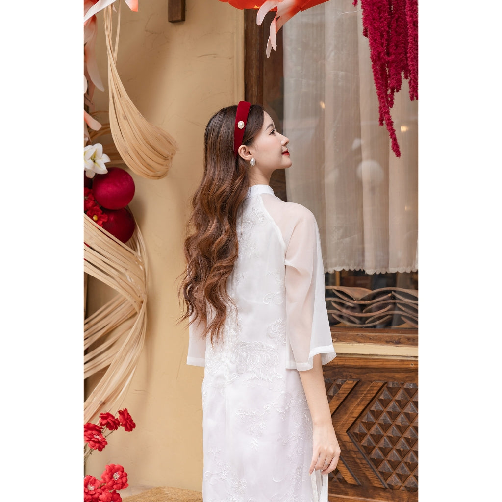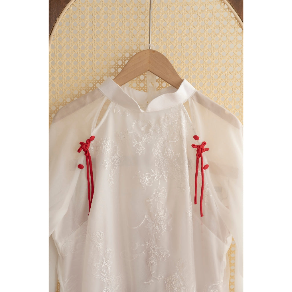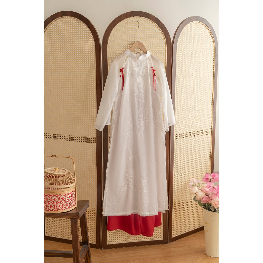 Home Innovative Ao Dai designed by MỘNG HỒ in white with embroidered floral motifs and red bow, made of high quality silk and silk - SD002 LANA DESIGN