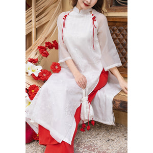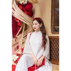 Innovative Ao Dai designed by MỘNG HỒ in white with embroidered floral pattern and red bow made of silk and high-quality red silk pants by LANA DESIGN