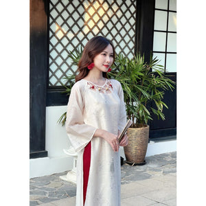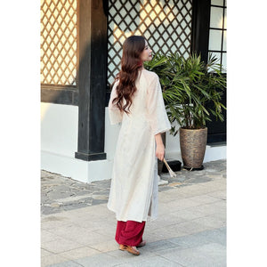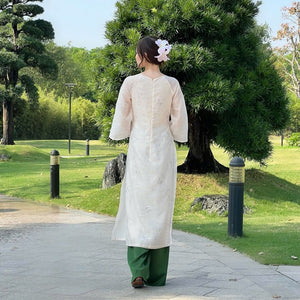 The Ao Dai is made from high-quality silk with bamboo motifs printed on the silk flap, graceful like a strand of cloud, bringing the gentle, graceful beauty of Vietnam to the wearer's figure. Combined with pearl silk pants, it creates a luxurious, smooth and comfortable feeling.