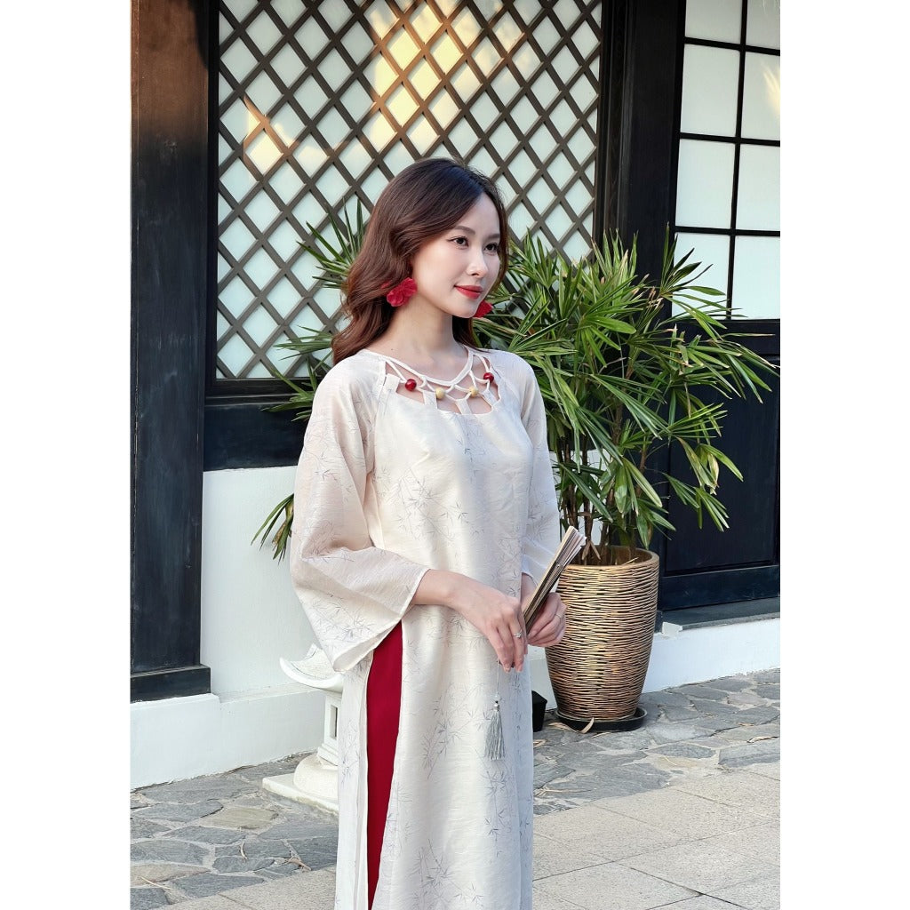 Truc Hong innovative ao dai with bamboo motifs and pearl silk, stylized collar with wooden beads – SD010 LANA DESIGN