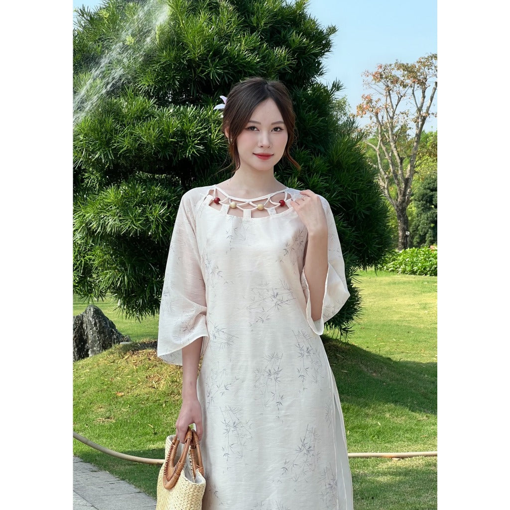 Truc Hong innovative ao dai with bamboo motifs and pearl silk, stylized collar with wooden beads – SD010