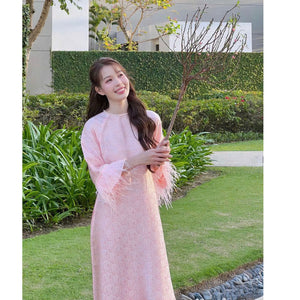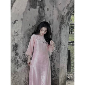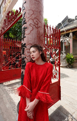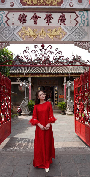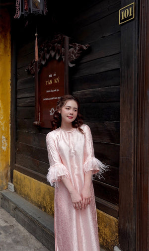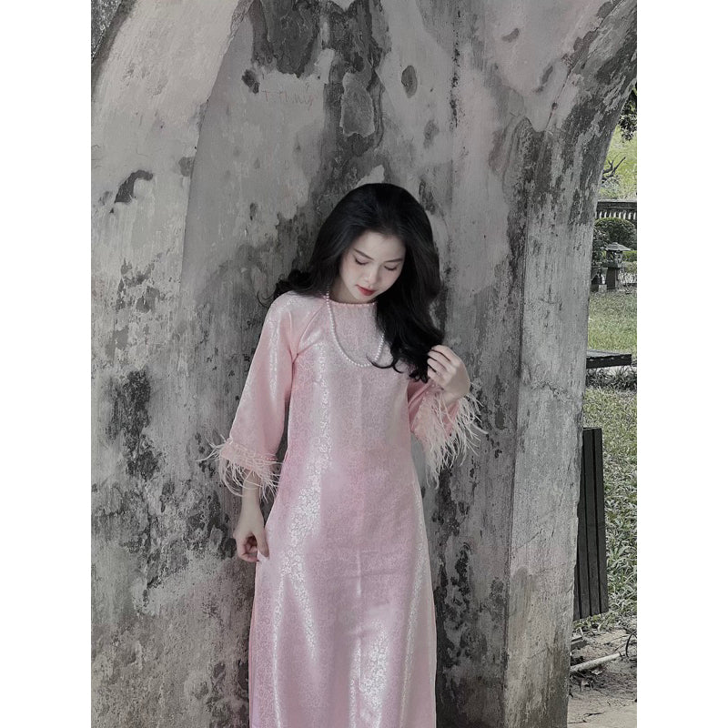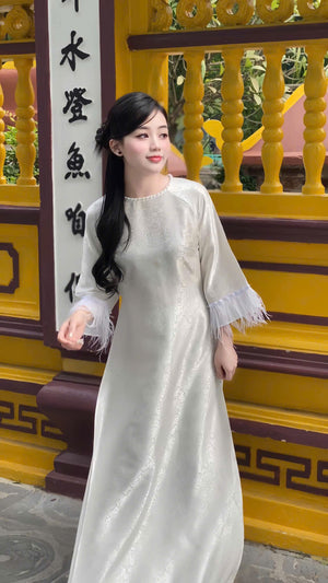 Loose-fitting brocade Ao Dai with flared sleeves and feather embellishments - Moc An Ao Dai