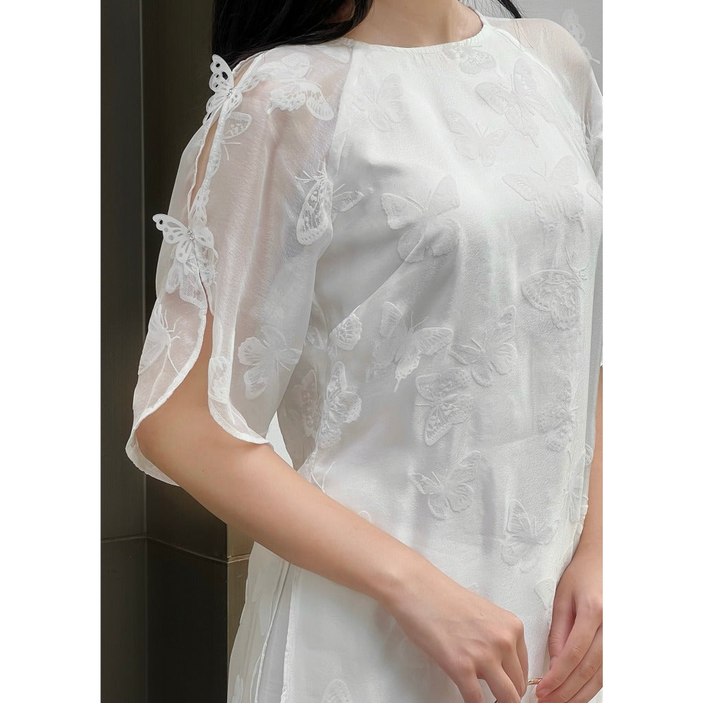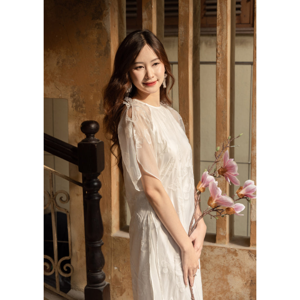 Ngoc Diep designed women's ao dai with butterfly embroidery pattern, high-quality silk fabric, velvet pressed with Latin silk - SD007