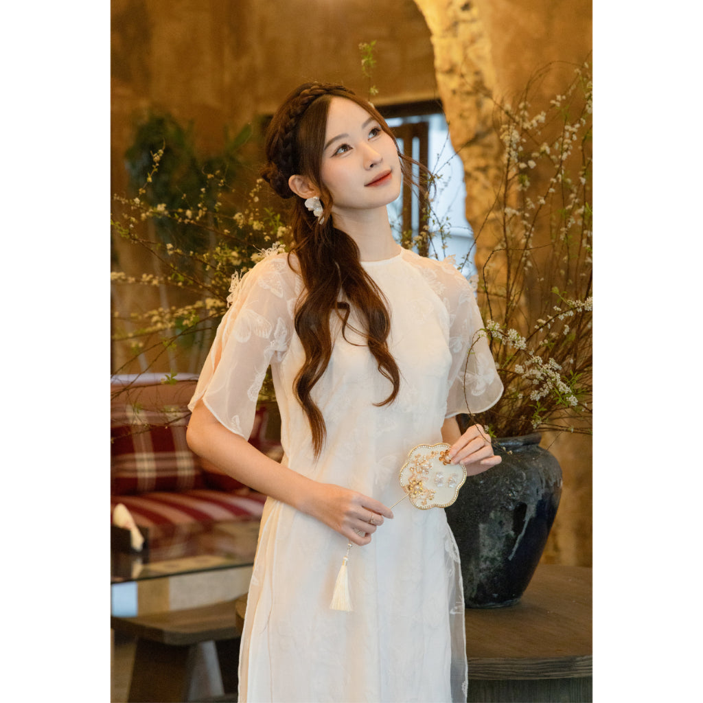 Ngoc Diep designed women's ao dai with butterfly embroidery pattern, made of velvet-pressed silk mixed with high-quality Latin silk - SD007 LANA DESIGN