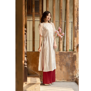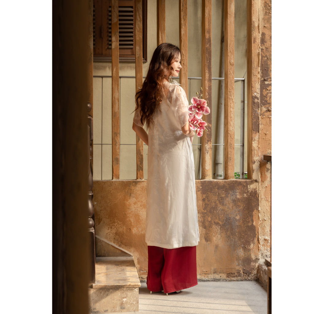 Ao dai made from American silk pressed with velvet and mixed with Latin silk, soft, light, airy and standard form. High quality pearl silk pants, creating a luxurious and comfortable feeling.