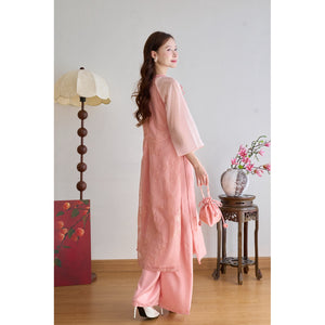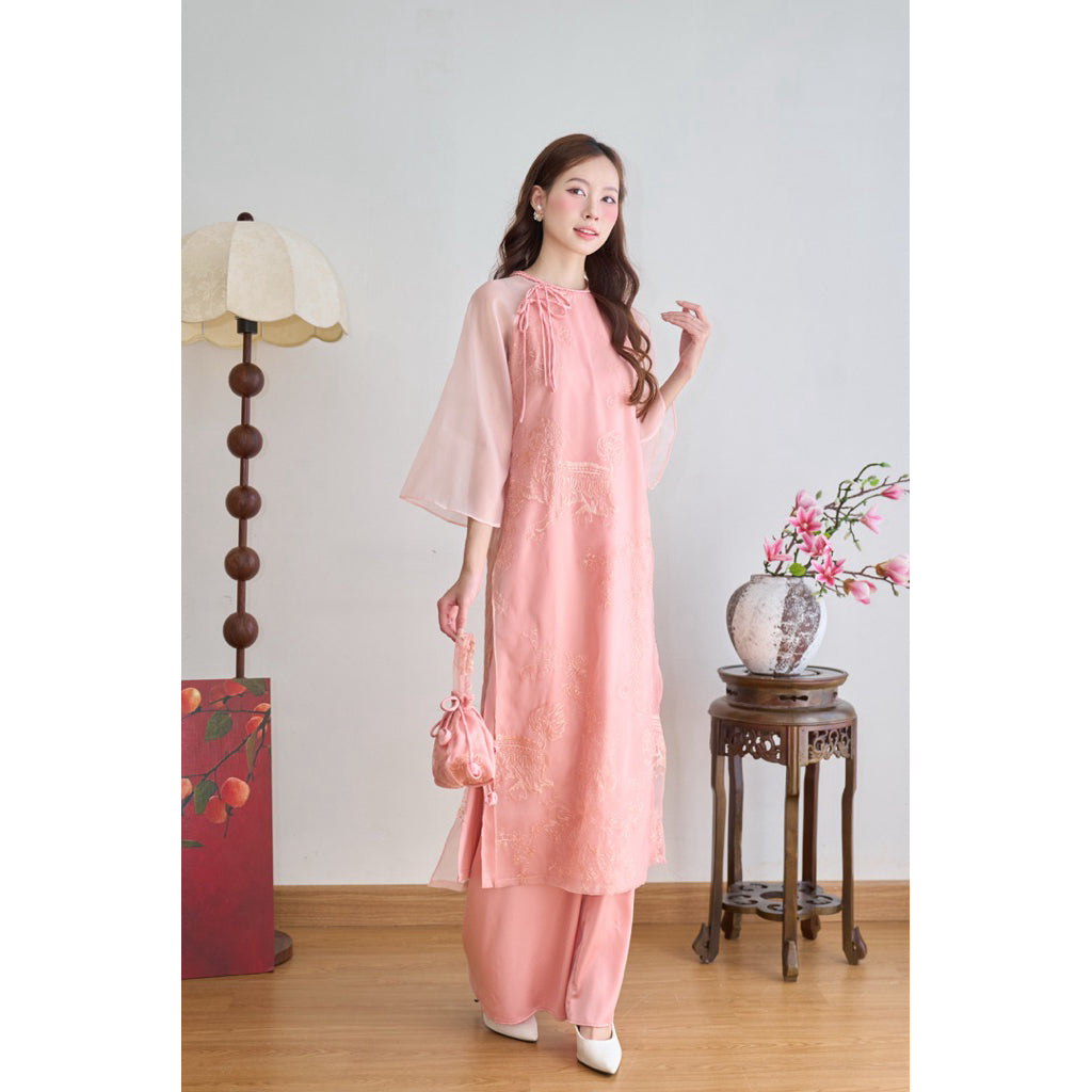 Going out in Ngoc Nghien's Ao Dai is so graceful. LA.NA used soft glass silk embroidered with unicorns for the Ao Dai, mirror silk sleeves and pearl silk pants. All are dyed a gentle deep pink-orange color.