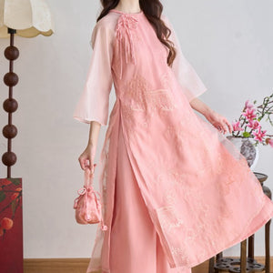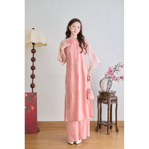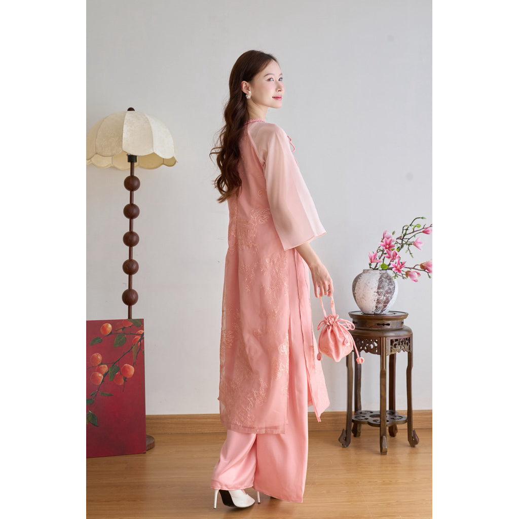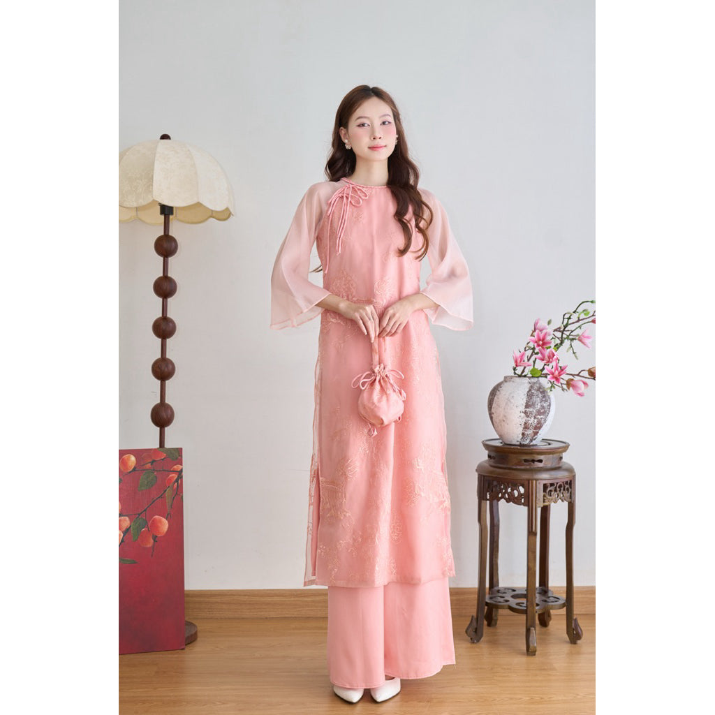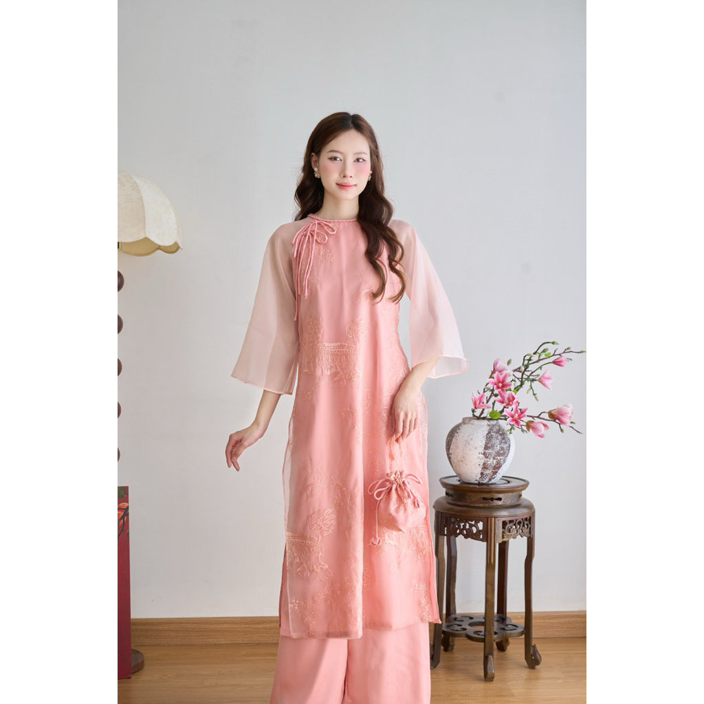 Ngoc Nghien designed women's ao dai with unicorn embroidery pattern, high quality silk material, pink Lana ao dai - SD006