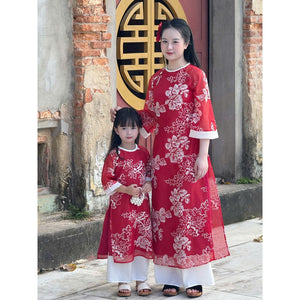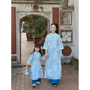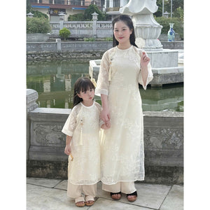 [PRE-ORDER] Mother and child Ao Dai with 2 panels of embroidered chiffon. Bow and pants