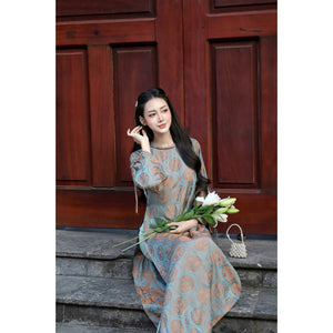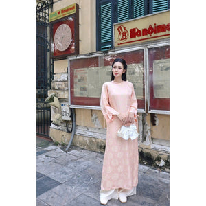 [PRE-ORDER] Thuy Tien Ao Dai in soft silk brocade, round neck, flared sleeves, with pants