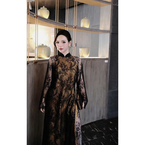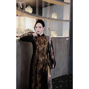 [PRE-ORDER] Loose-fit Ao Dai with lace design, slightly flared sleeves, embossed pattern, and pants
