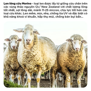 2. Merino wool: The best imported Australian wool on the market today. The wool is taken from sheep raised on the Australian/New Zealand grasslands with the best wool quality, long, thin hair fibers 11-25 microns, more durable than other types of sheep. The wool is soft, smooth, light, UV resistant and especially has the ability to lock bacteria, absorb odors, prevent dust...