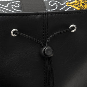 • Drawstring closure with an additional flap secured by a metal buckle.