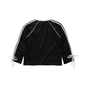 The design stands out with striped poly spandex material, along with embroidered graphics in the middle of the front body and lace bow details on the sleeves, creating an overall look that is both sporty and cute.