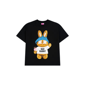 STICKY RABBIT TEE features a printed image of a stuffed rabbit holding an ice cream stick. Basic black tee design is easy to coordinate, thick 100% cotton material (250gsm) helps keep the standard shape, cool to wear all day long.
