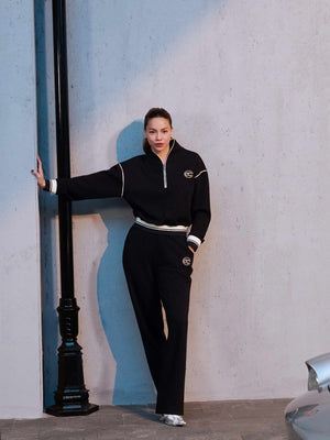 Home Set of ECOCHIC SYNC MOVE Zip-up Crop Top with Hem and Drawstring Straight Pants, High Quality Genuine Material HNH B205