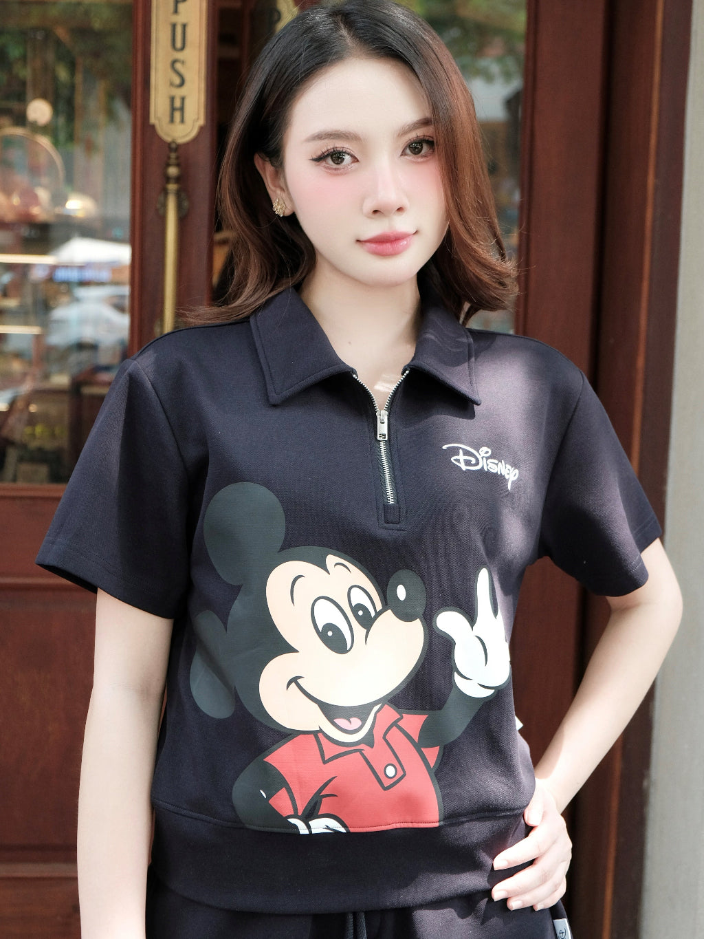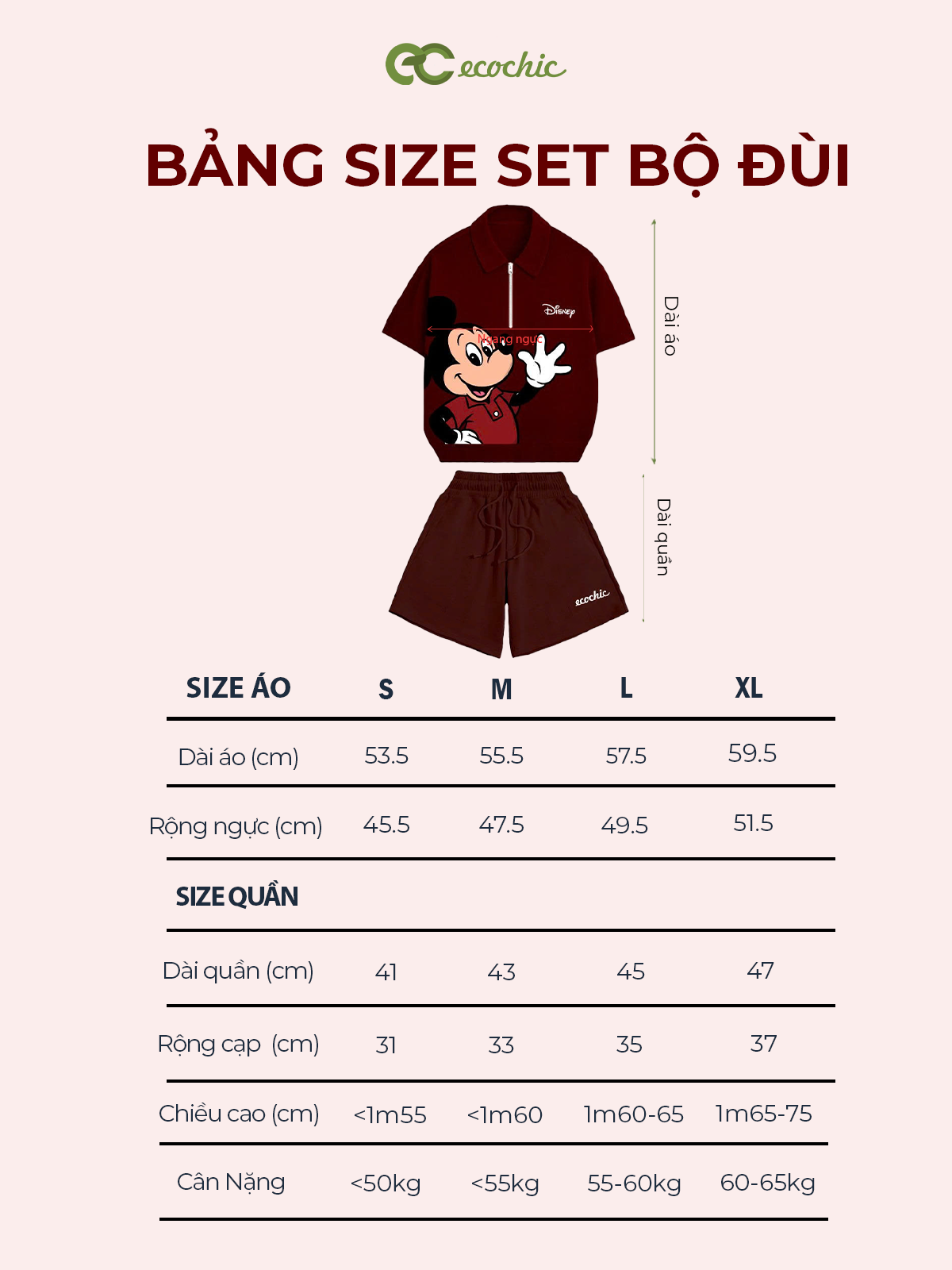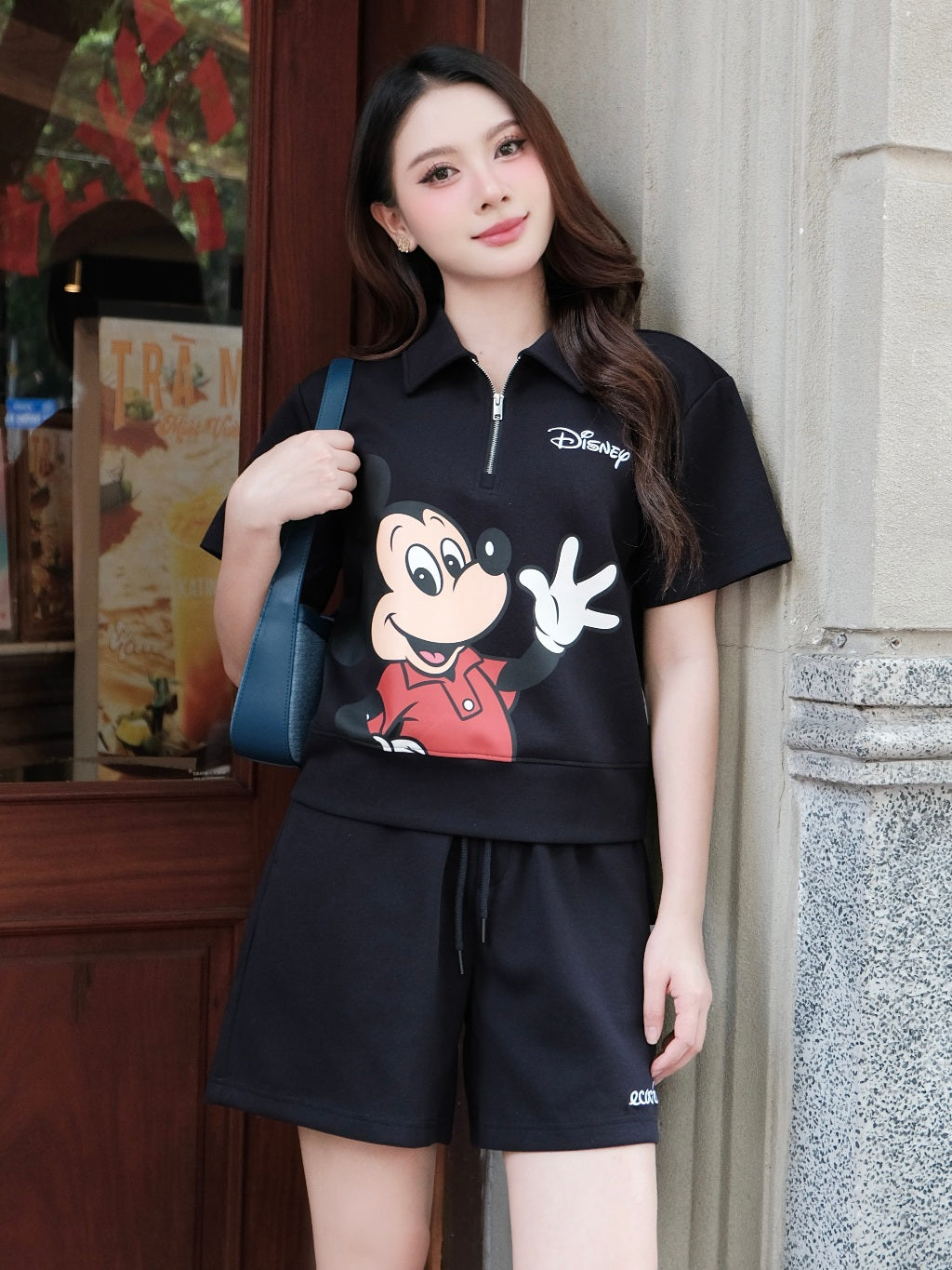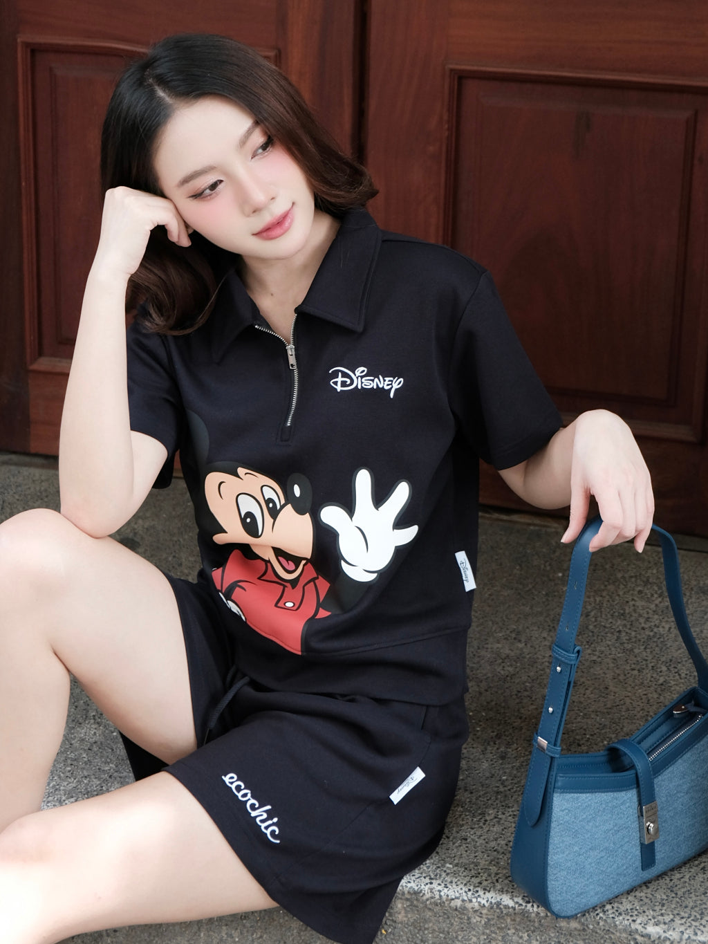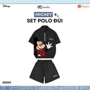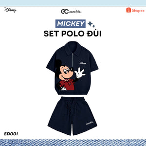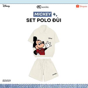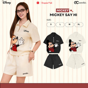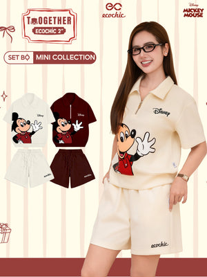ECOCHIC MICKEY SAY HI Pants Set Halfzip Polo Shirt High Waisted Shorts High Quality Soft Genuine Material SD001