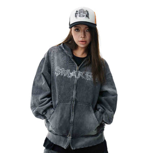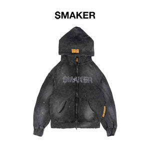 [SMAKER] Warm 100% cotton gray zip hoodie - $MAKER WEB DOUBLE ZIPS WASHED HOODIE IN GREY