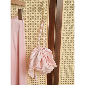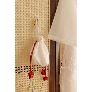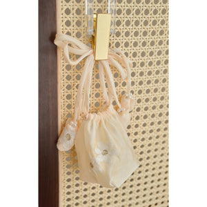 LA.NA brocade bag with innovative white design and luxurious drawstring floral pattern