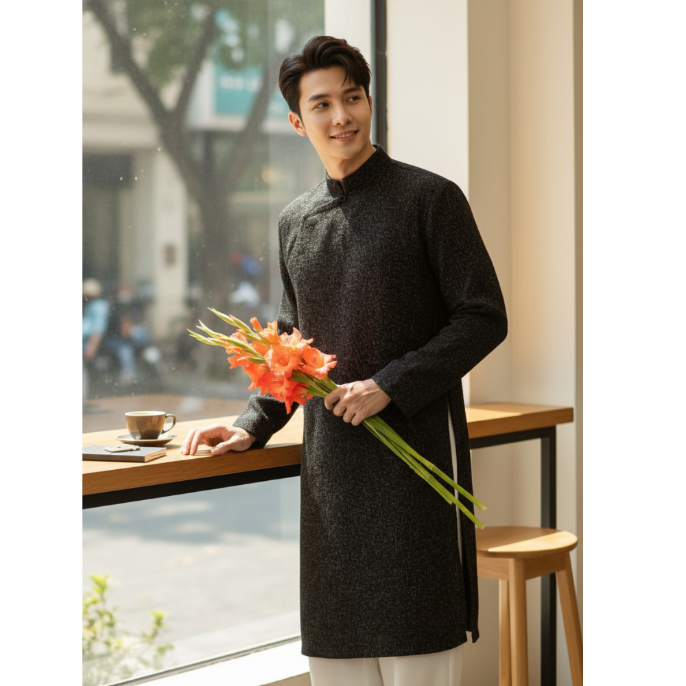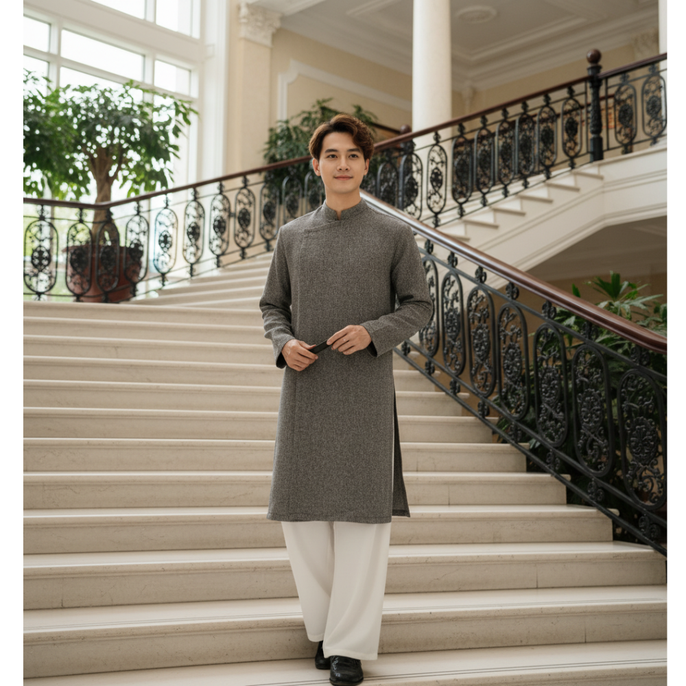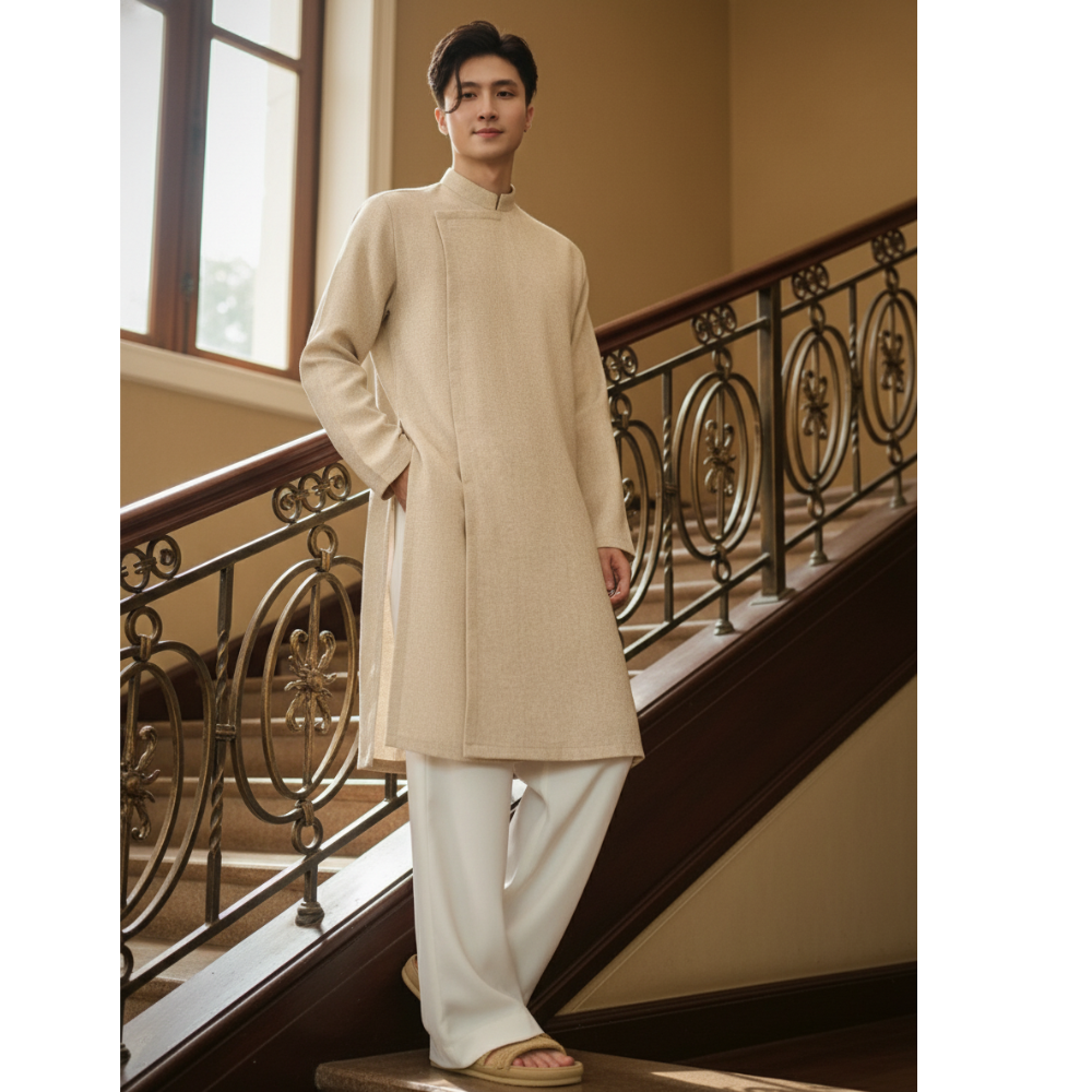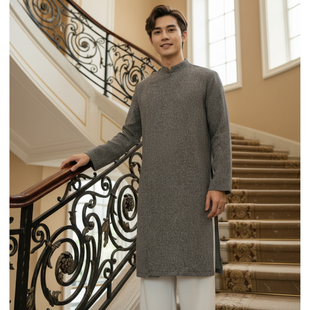 Áo Dài Cách Tân Nam Vải Dạ TWEED có cầu vai, cúc bấm ẩn - Áo Dài Mộc An