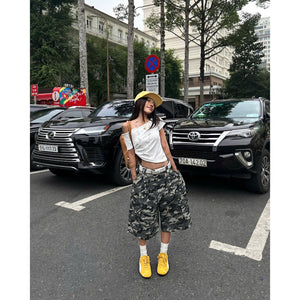 • Quần kaki camo lửng thiết kế unisex, độ dài qua gối, ống rộng
