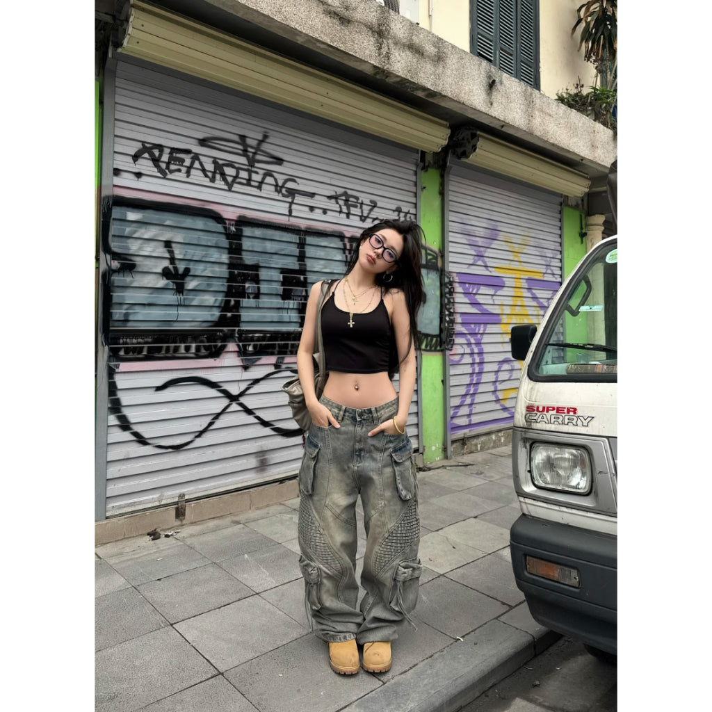 • Quần form suông, cạp quần trễ, độ dài phủ gót
