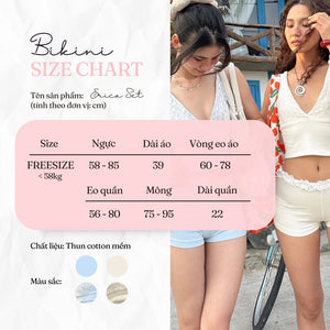 Set đồ 2 món gồm áo croptop phối ren quyến rũ và quần short bo viền siêu tôn dáng. Chất vải mềm mịn, co giãn tốt, giúp bạn thoải mái di chuyển. Phù hợp để diện đi biển, du lịch