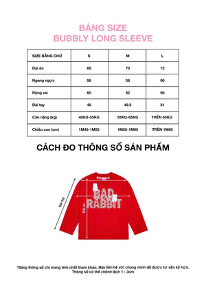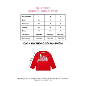 Chiếc áo thun tay dài với tone đỏ nổi bật – dành cho những ngày bạn muốn “pop up” mood của chính mình. BUBBLY LONG SLEEVE sử dụng chất vải cotton dày dặn 250gsm, in lụa logo BAD RABBIT mặt trước, đi kèm 2 đầu thỏ bông đính thủ công – một signature không thể thiếu của BST Just Feel.