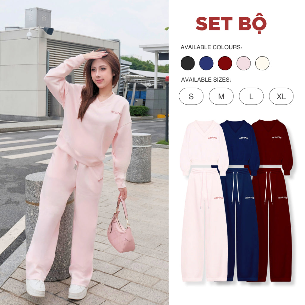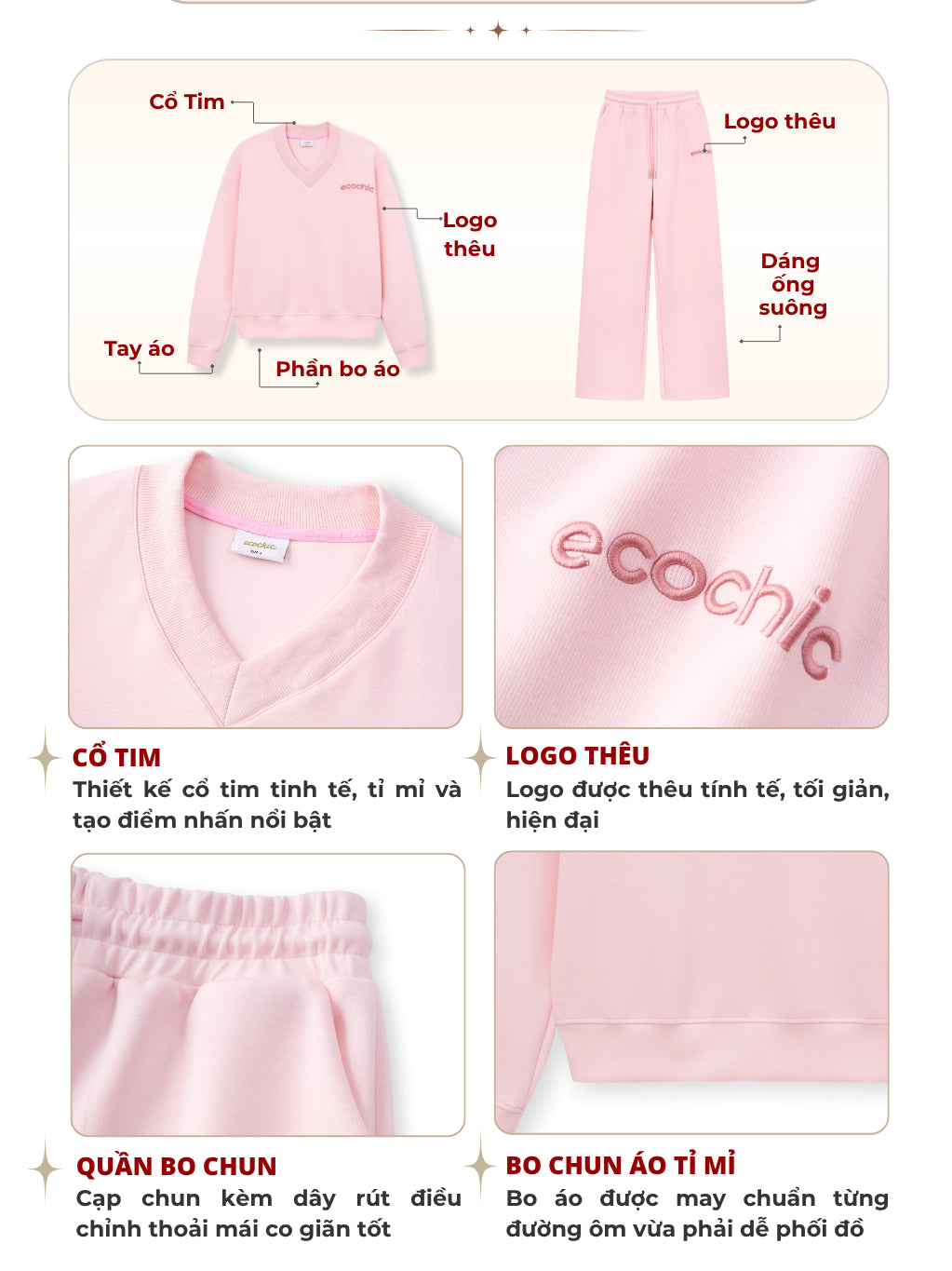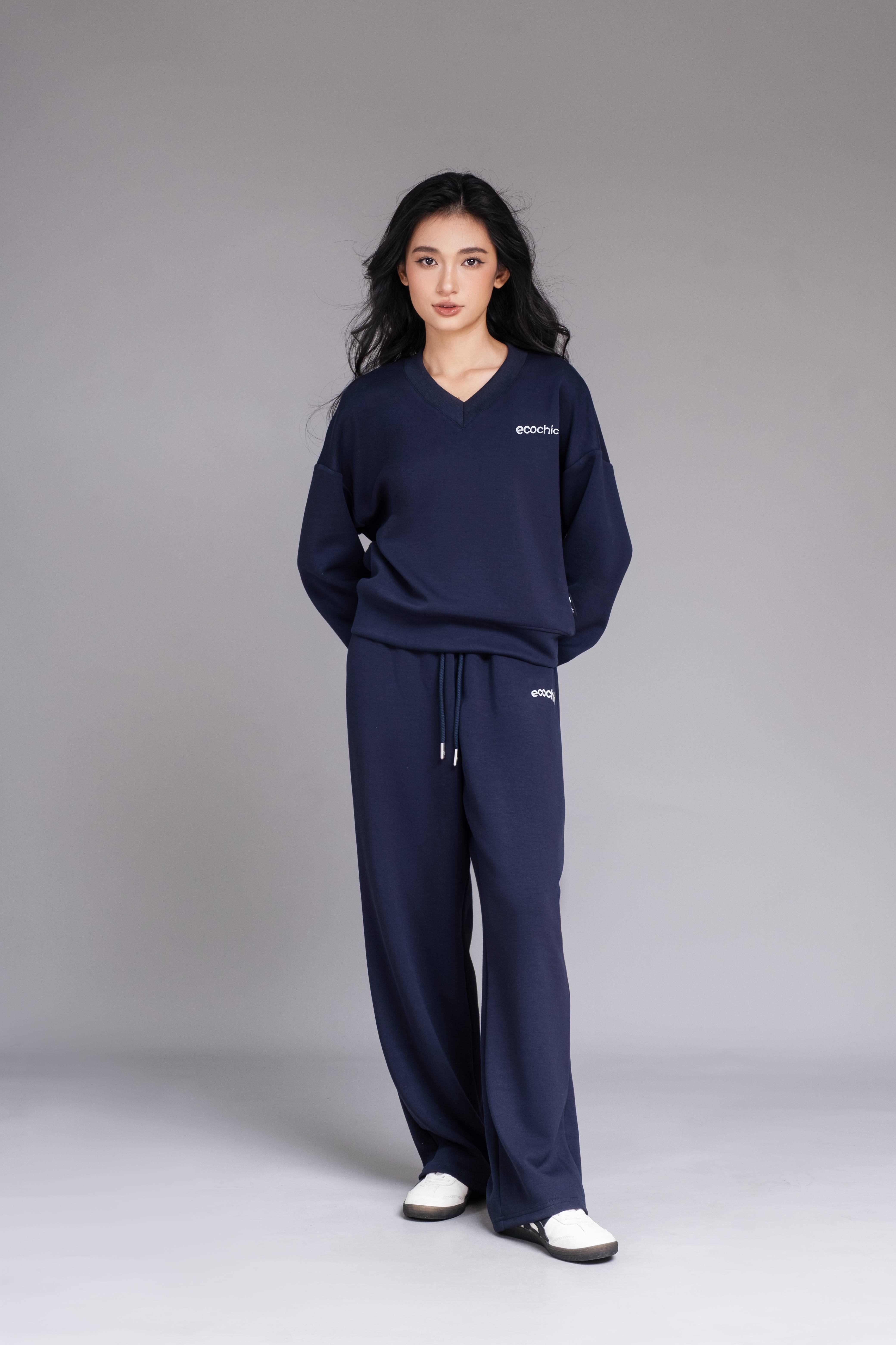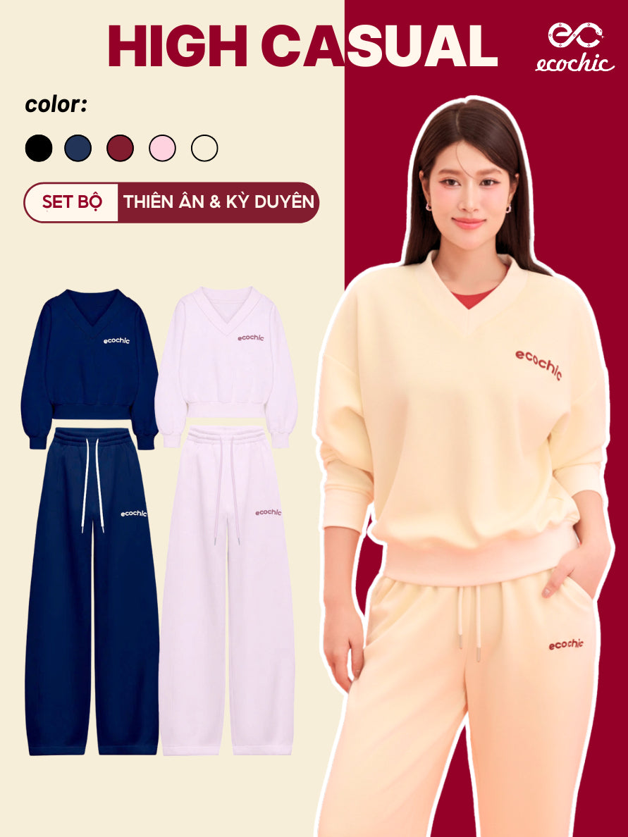 Set Bộ ECOCHIC SILENT LUXE Áo Cổ Tim Basic Quần Suông Cạp Cao Chất Liệu Vải Thun Cosy Sọc Cao Cấp Chính Hãng B184