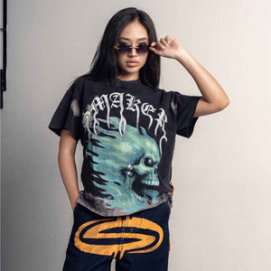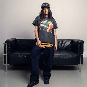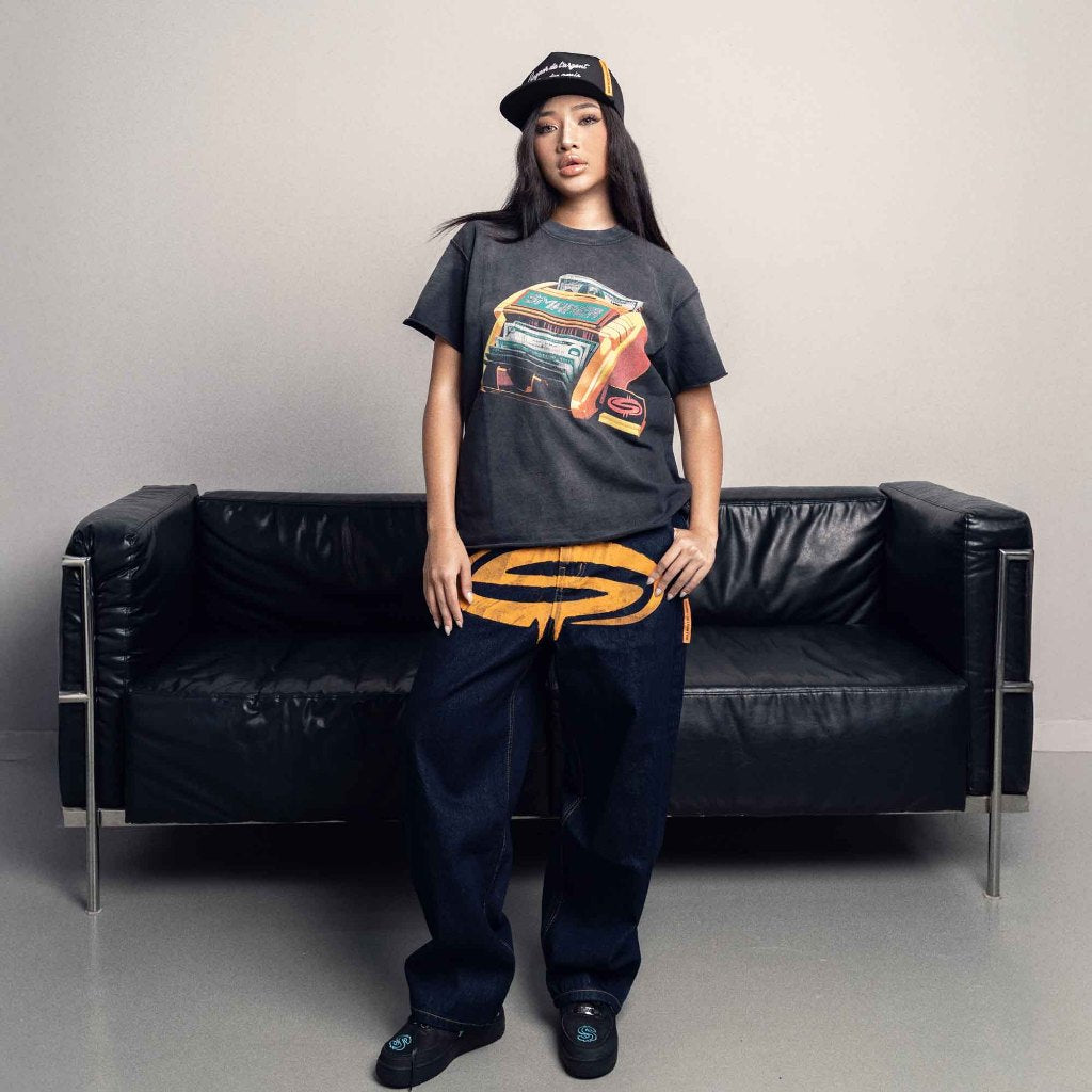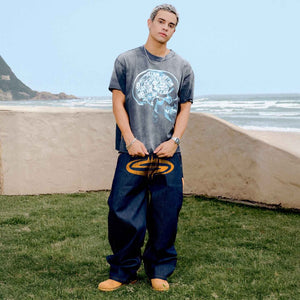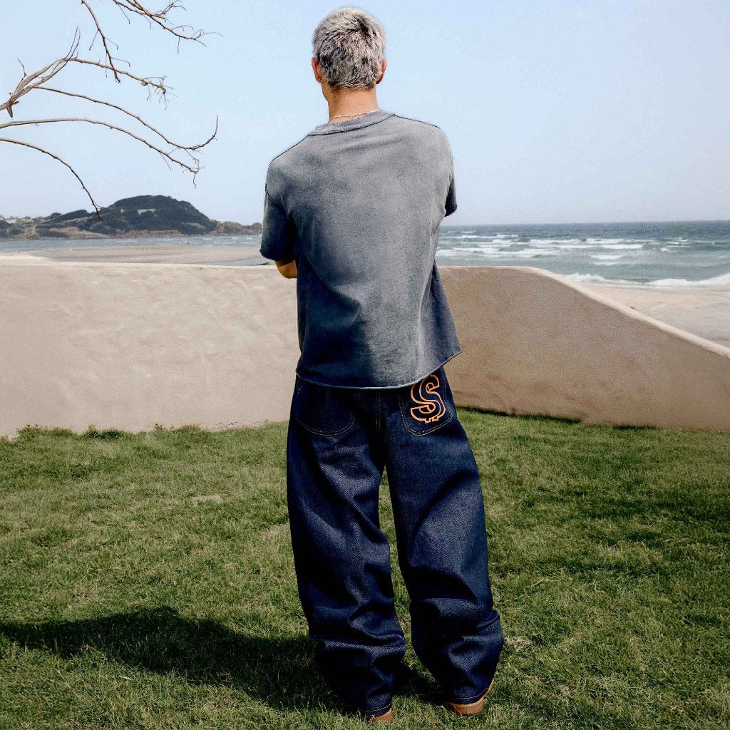 [SMAKER] Quần jeans màu xanh dương đậm dáng form ống rộng - LOGO RAW DENIM JEANS